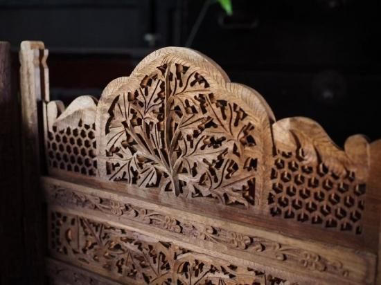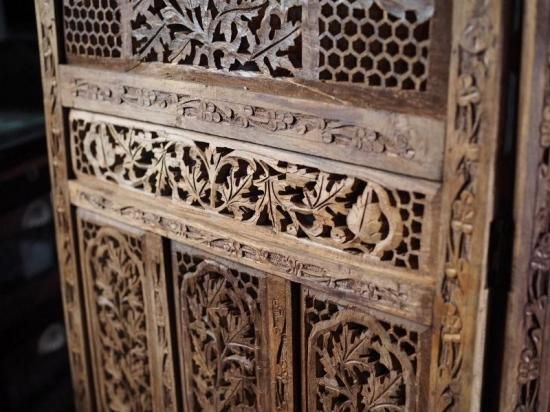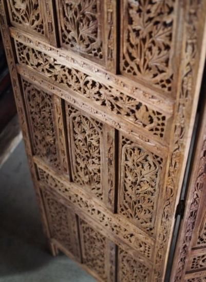 【商品説明】緻密な彫刻の折畳3連パーテーション 昭和中期。元は4連ですが一枚欠品のため3連となります。元オーナーさんが使い勝手で外したのでしょう。とても緻密で重量ある衝立です。劣化については画像・動画をご確認ください。不明点は電話・LINE・メール・Instagramメッセージにてお問い合わせください。誠実にお答えいたします。