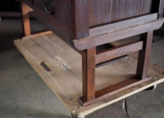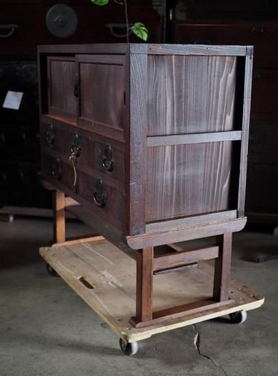 【商品説明】前欅無垢板 脚付アンティークローボード テレビ台に 明治時代。引き戸内にデッキ類を収納し 裏面に穴を開けて配線するとテレビ台として雰囲気ありますね。劣化については画像・動画をご確認ください。不明点は電話・LINE・メール・Instagramメッセージにてお問い合わせください。誠実にお答えいたします。
