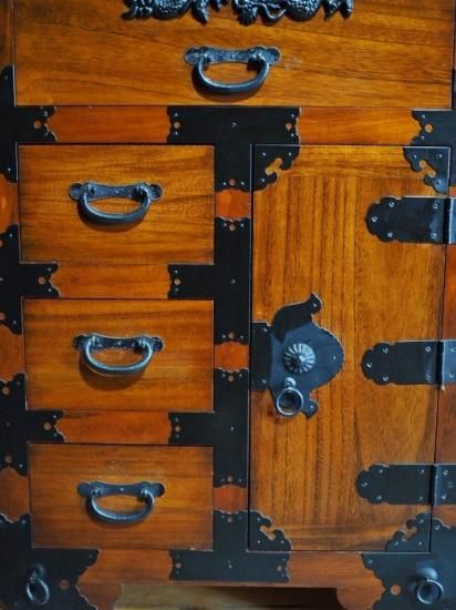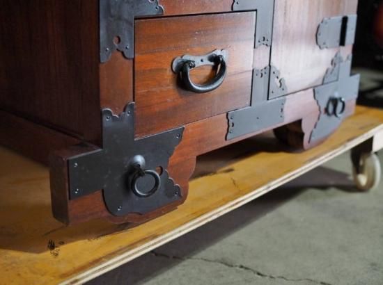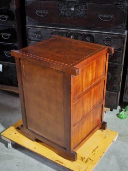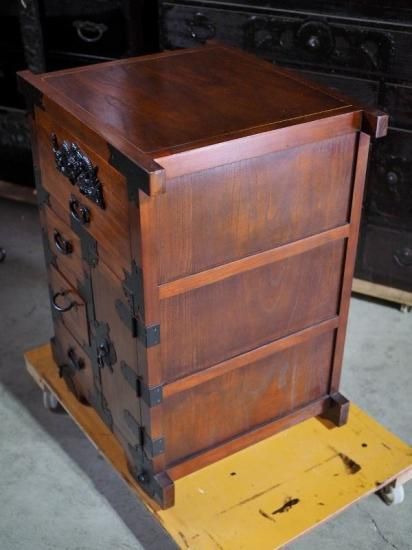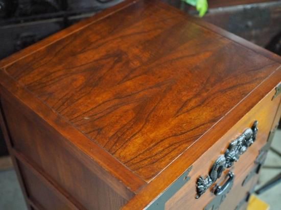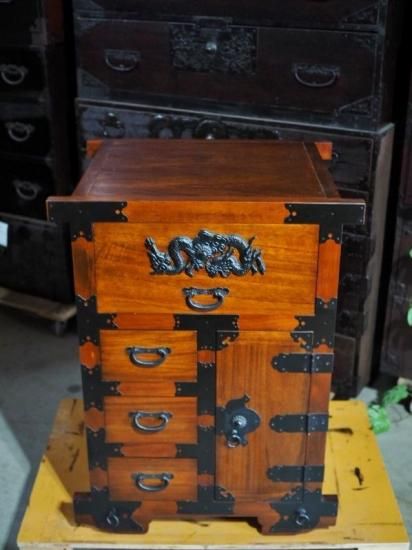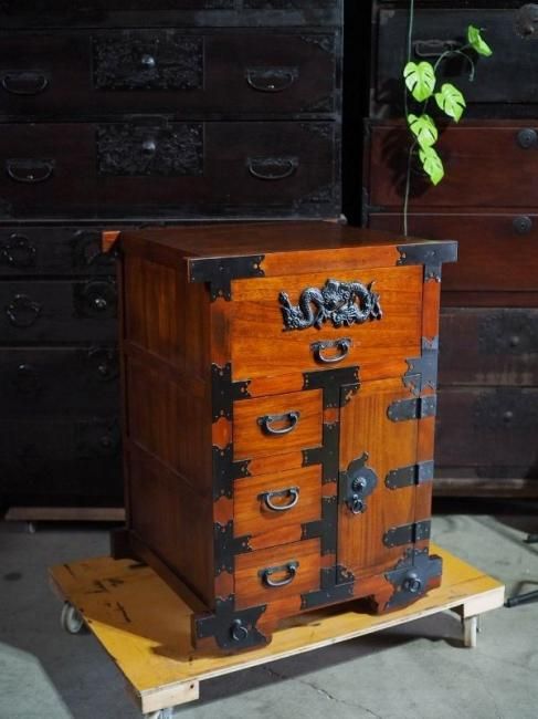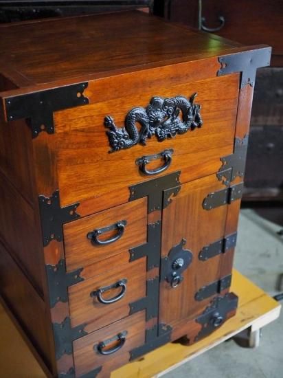 A small, antique-style car wardrobe, antique chest, modern item.