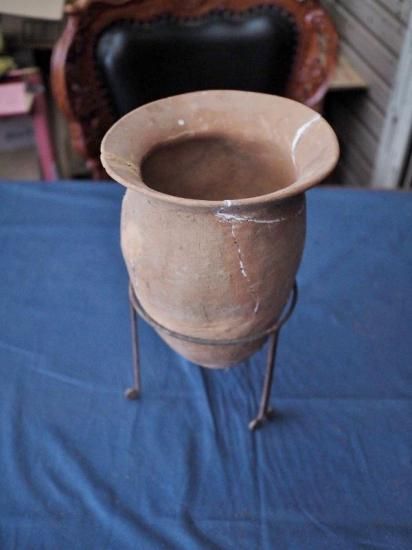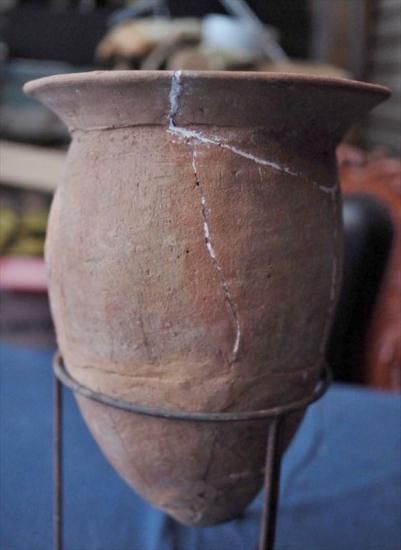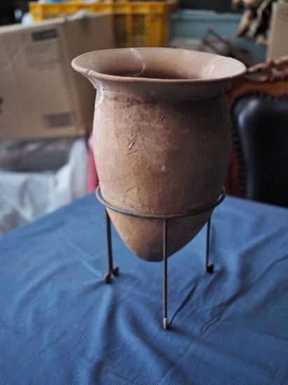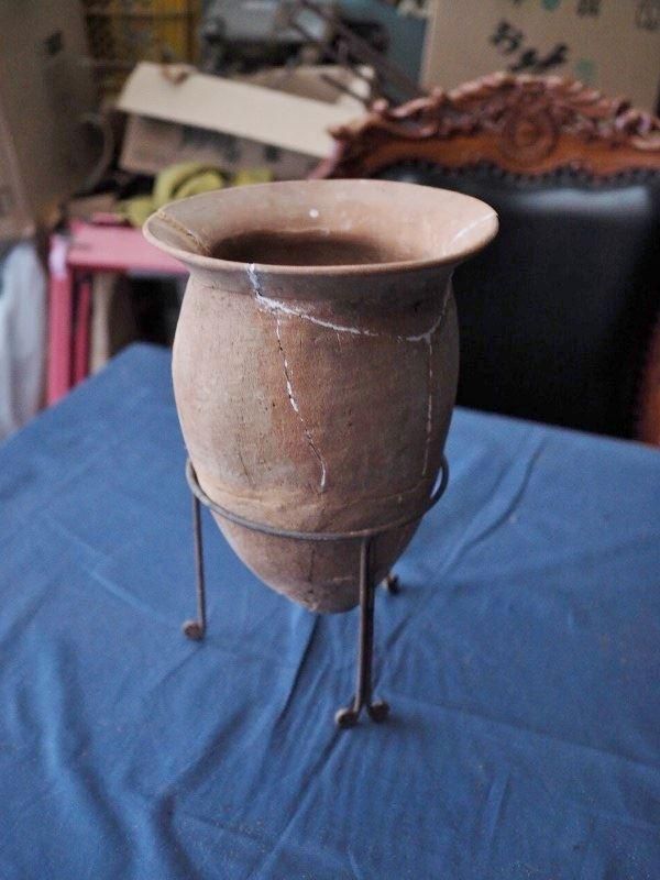 Ancient jar-shaped pottery, Haji ware, from the late Kofun period, circa the 6th century, approximately 1400-1500 years ago. It comes with a display stand. Around the 5th century, indoor fireplaces shifted from open-fire hearths to hearths. As a result, the shape of the jar changed from a bulging copper section to a sleek body designed for the hearth. Furthermore, during the Nara and Heian periods, the body lengthened even further, and the rim changed from horizontal to vertical. Based on the shape of the item, it is estimated to date to the Izumi-Kitaka period in eastern Japan. While there are signs of repair, this is a rare find unearthed in its entirety. Enjoy it as a flower vase or other display piece. Please check the images and video for signs of deterioration. (¡ý [Note] ¡ Items larger than K size cannot be delivered via "household goods delivery" on Tuesdays. ¢ Items larger than 220 and H size cannot be delivered to some remote islands.) If you have any questions, please contact us by phone, LINE, email, or Instagram message. We will answer your questions honestly.
