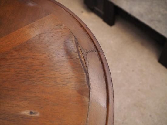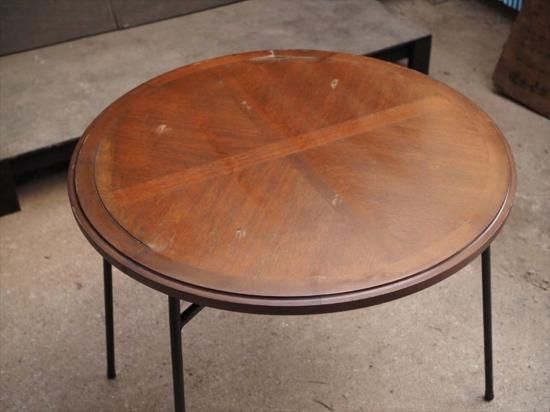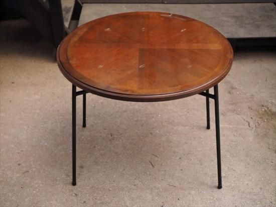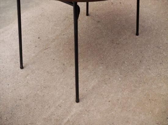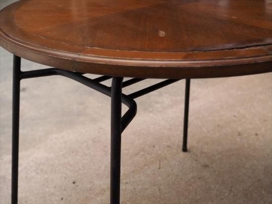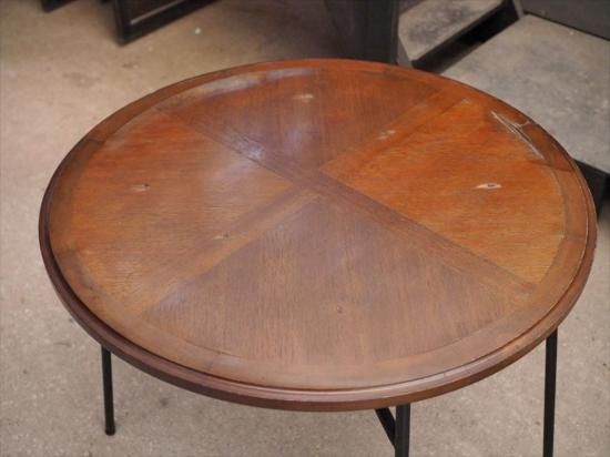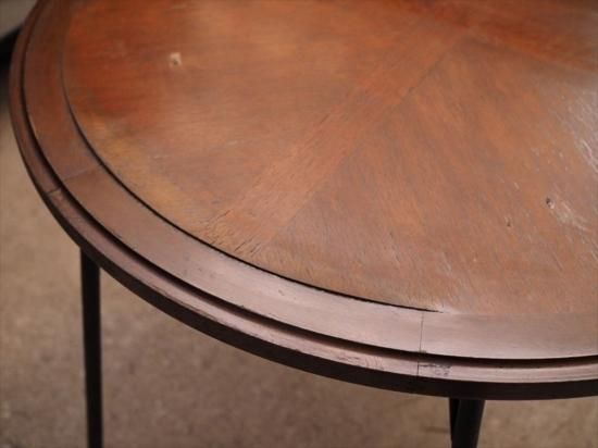 Refurbished round table with iron legs. The tabletop is damaged. Outlet.
