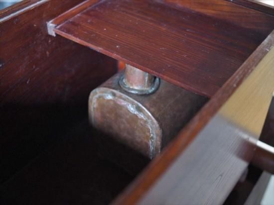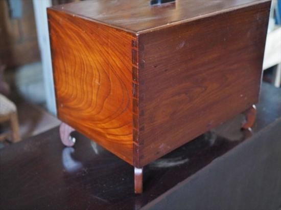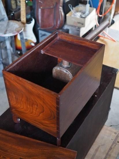 A rare antique folk item, a warmer made entirely from Japanese zelkova. Its purpose is unknown, dating from the Taisho to early Showa era. The interior of this zelkova box with legs resembles a steam engine. What was it used for?